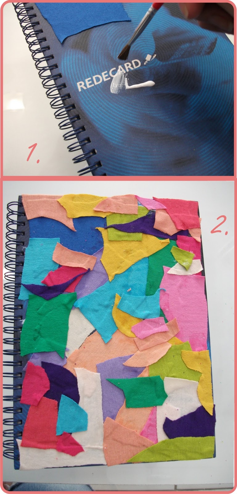 Pegue o pincel e passe cola para tecido na agenda e vá colando os retalhos, passe cola em cima do tecido para colar retalhos sobre eles.